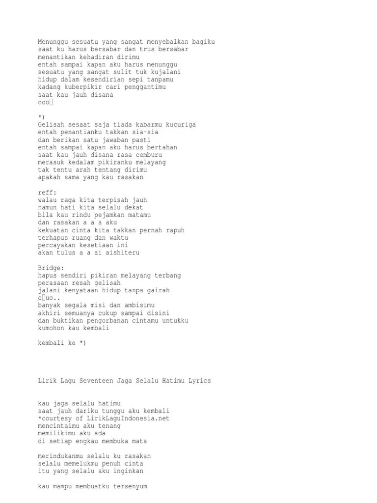 Lirik Lagu Seventeen Jaga Selalu Hatimu Kunci Gitar : Not Angka Pianika Seventeen Kemarin : Berikut ini aku membahas kunci gitar jaga selalu hatimu lagu yang di populerkan oleh band seventeen, kunci gitar sangat mudah sekali di .. G c tunggu aku kembali. Bm e a kau jaga selalu hatimu. F# bm e a saat jauh dariku tunggu aku kembali A dm saat jauh dariku. E a d g b e.